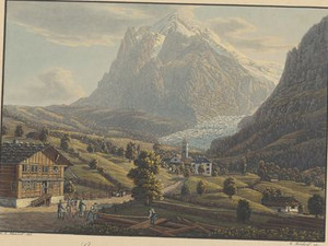Als Johann Ludwig Aberli um 1768 diese Ansicht zeichnete, war der Untere Grindelwaldgletscher weniger eindrucksvoll als fünfzig Jahre später. Er endete am Ausgang der Gletscherschlucht auf den Schopffelsen und vom Tal aus sah man ihn nicht besonders gut. Trotzdem besuchten Touristen die Stelle, wo die Lütschine aus der Gletscherschlucht hervorsprudelte.