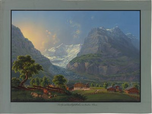 Diese Gouache von Johann Ludwig Bleuler zeigt den Gletscher in der Morgendämmerung. Der Ursprung beim Ischmeer ist schon von der Sonne beschienen, während der bis in den Talboden reichende Schweif sich noch im Schatten des Mättenbergs befindet. Geschickt kontrastiert Bleuler die ordentliche Dorfansicht im Vordergrund mit den ungestümen Eismassen des Unteren Grindelwaldgletschers.