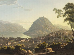 Oberhalb der Strasse nach Melide präsentiert sich die Seeseite von Lugano. Im Vordergrund sehen wir den Fuss des Monte San Salvatore. Johann Gottfried Ebel (1764-1830) berichtet uns von dieser Gegend folgendes: "Die Vipern wohnen hier in so grosser Zahl, dass die Bewohner eines dort stehenden Hauses gezwungen wurden, es zu verlassen. Im Sommer schwimmen sie heerdenweise nach den kühlen Wäldern an dem anderen Ufer; des Winters kehren sie an den Fuss des Salvador zurück, und rollen sich so ineinander, dass sie Kugeln bilden, die nur mit Köpfen gespickt sind."