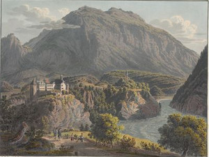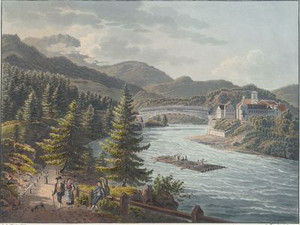 Bei der Brücke von Reichenau fliessen der Vorder- und der Hinterrhein zusammen. Das danebenstehende Schloss entstand im 17. Jahrhundert und beherbergte von 1793-98 eine Schule. Einer ihrer Lehrer war ein gewisser Monsieur Chabos, der jedoch eigentlich Louis Philippe d'Orléans hiess und 1830 König von Frankreich werden sollte. So wie es auf dieser Ansicht aussieht, wurde das Schloss dann erst 1820 hergerichtet, als es in den Besitz der Familie von Planta kam.